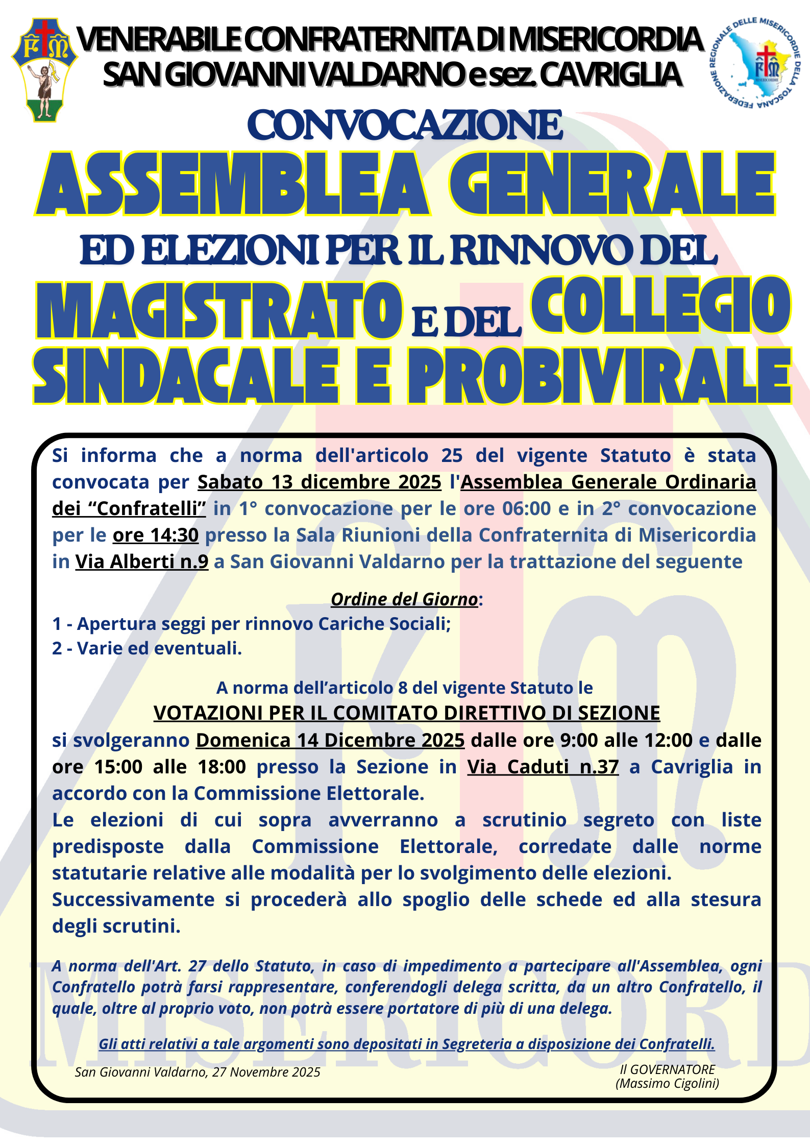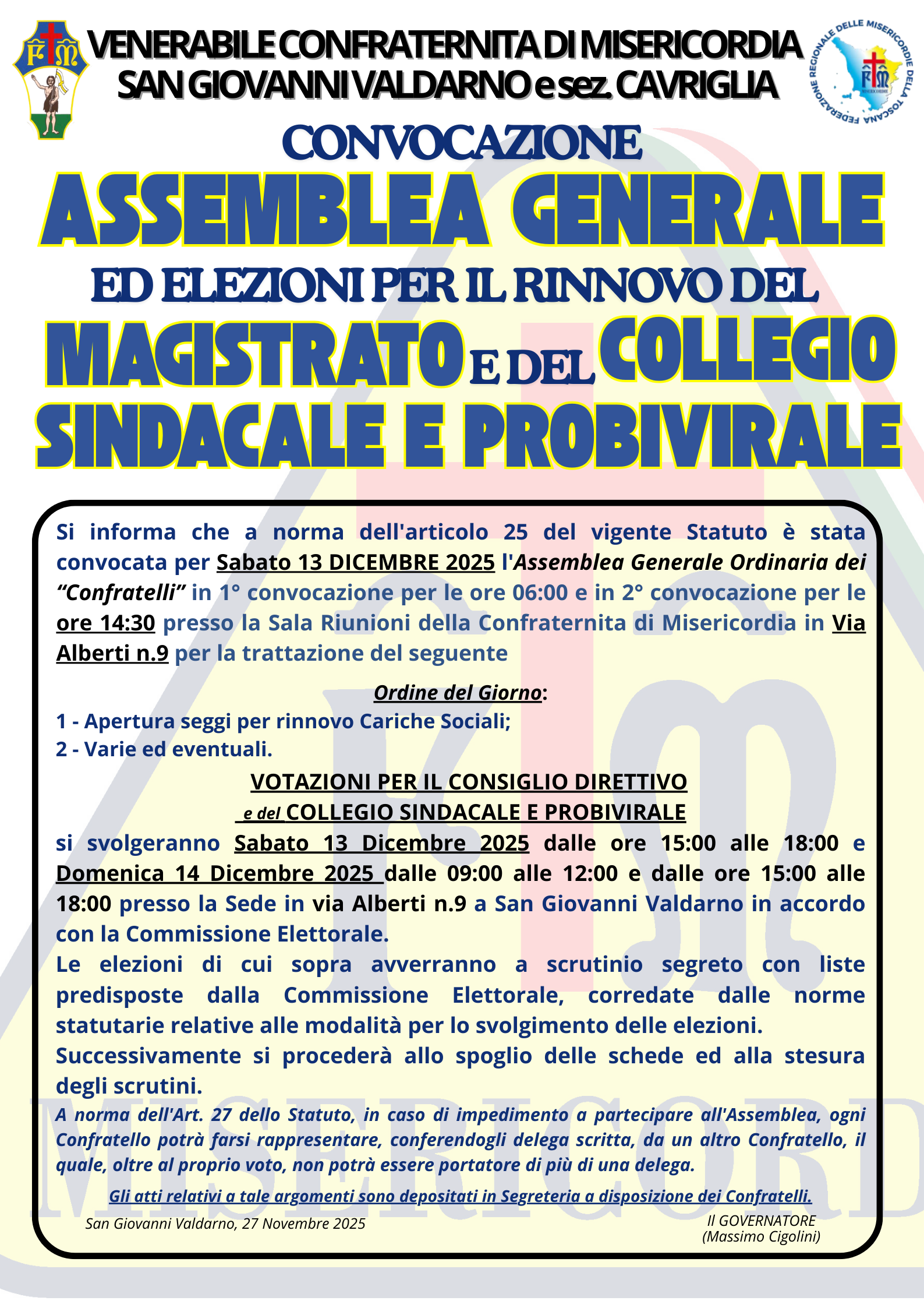 Convocazione ASSEMBLEA GENERALE ed elezioni per il rinnovo del MAGISTRATO e del COLLEGIO SINDACALE e PROBIVIRALE